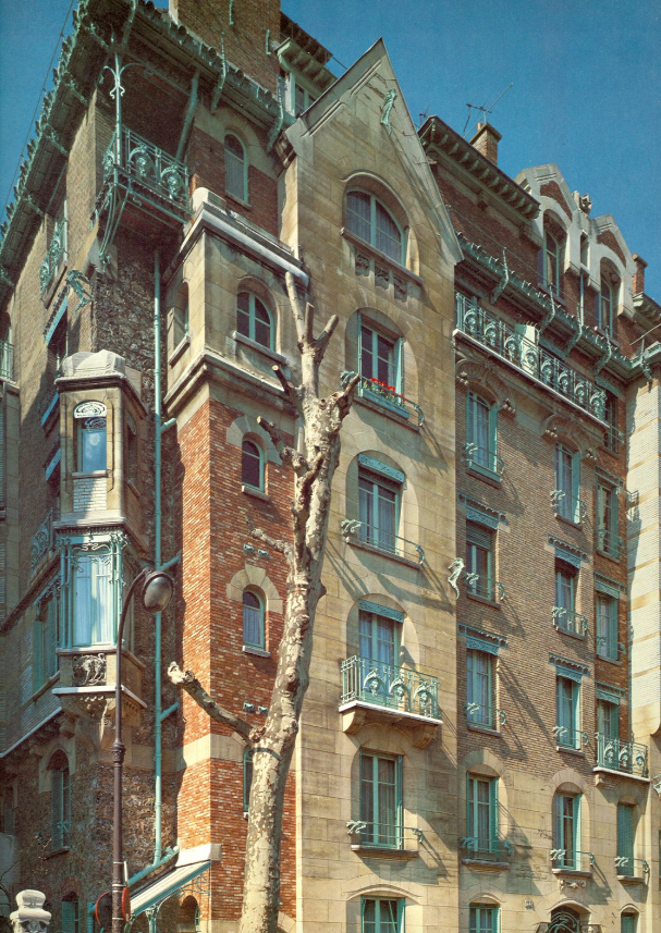 Les plans sont entièrement dessinés et le chantier entamé quand le jeune architecte en 1895 part en Belgique à l’invitation de l’architecte Victor Horta. La conversion de Guimard à l’Art-Nouveau se fait durant ce voyage à Bruxelles où il visite l’hôtel Tassel tout juste achevé. C’est un véritable choc pour Hector Guimard qui, lorsqu’il rentre à Paris, reprend toute la décoration du bâtiment dans une véritable frénésie. Sur les volumes du gros oeuvre se répand à profusion la ligne organique en coup de fouet importée de Belgique et que l’on retrouve dans la ferronnerie, la fonte, les vitraux etc…Guimard reprend également la décoration intérieure et dessine tout, le papier peint, les lambris le mobilier intégré. Mais si Hector Guimard s’inspire de Horta pour certains éléments de sa décoration il parvient à une rapide interprétation toute personnelle de la