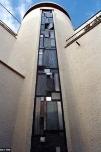 magnifique vitrail qui court sur toute la hauteur de l’escalier. Réalisé par Le maître verrier Louis Barillet il montre un nouveau, moderne et révolutionnaire travail de verres industriels colorés que Mallet-Stevens intègrera presque systématiquement dans toutes ses constructions. L’intérêt de Mallet-Stevens pour les arts d’avant-garde se révèlera avec la création de l’U.A.M en 1929 dont il sera le président et qui regroupera tous les artistes et décorateurs souhaitant faire entrer la modernité dans la création: les artistes réaliseront de nouvelles formes grâce aux nouveaux matériaux issus des découvertes industriels ; ainsi feront-ils la part belle au fonctionnalisme et à la standardisation.