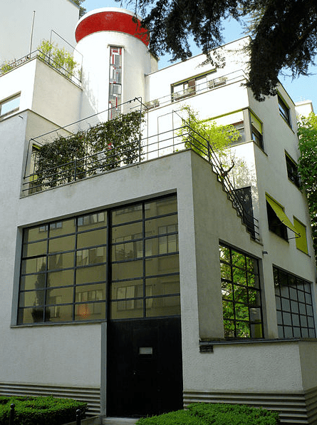 volumes géométriques simples, cylindre, obliques, cubes et rectangles. L’escalier est surmonté d’un disque en ciment recouvert dans sa sous-face d’un carrelage de mosaïque rouge, tandis que les stores jaunes, et le noir des huisseries apportent un jeu de couleurs franches à l’édifice recouvert d’un enduit blanc. Il est intéressant de noter que Mallet-Stevens a toujours suivi les mouvements d’avant garde et notamment le mouvement De Stijl dont Mondrian est le principal représentant en France…ne devrait on pas alors regarder l’architecture de l’atelier Martel comme une composition des tableaux abstraits de Mondrian? Notons également l’intérêt que porte l’architecte à toutes les nouvelles formes d’art avec le