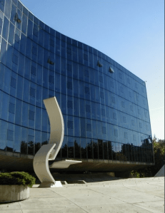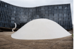 est également soutenu par une grosse dalle décollée au dessus des infrastructures. Le bâtiment est le résultat d’une collaboration avec de nombreux architectes, constructeurs et ingénieurs comme Jean Delaroche, Paul Chemotov et Jean Prouvé pour la remarquable façade rideau qui prend la forme d’un large pan vitré ondulant et dont les menuiseries sont peu visibles. Le bâtiment principal, en S, ondule devant le dôme. Oscar Niemeyer est influencé par Le Corbusier et pourtant s’en démarque fortement à travers son goût prononcé pour les courbes à l’opposé du style rigide et fonctionnel de l’architecte français : « alors que l’angle droit sépare, divise, j’ai toujours aimé les courbes qui sont l’essence même de la nature environnante » déclarait il. Ainsi, la coupole, dame de béton de base conique se termine par une calotte sphérique et représente le ventre fécond d’une mère. A l’intérieur du dôme les lamelles d’aluminium ionisée assurent à cette salle une décor féérique mais aussi une