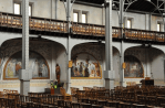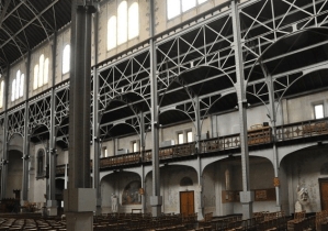 celles des églises basques dont est originaire le curé, sont portées par des arcs en anse de panier qui délimitent de petites chapelles décorées de motifs floraux Art Nouveau alors très à la mode. Les colonnes métalliques supportant les fermes sont les véritables colonnes de nos églises classiques. L’abbé vantait l’avantage de ces poteaux fins laissant une bonne visibilité vers le choeur contrairement aux lourd piliers de pierre des églises romanes ou gothiques. L’église, achevée en 1901 fut alors aménagée et décorée de grandes toiles semi-circulaires réalisées dans les dix chapelles tout autour de l’église. Elles sont
