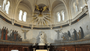 l’oeuvre du peintre Joseph Uberti et d’Emile Desarche et ont pour thème les saints patrons des travailleurs avec par exemple la chapelle de la Sainte Famille où Joseph représente le patron des menuisiers et charpentiers ou la chapelle St Eloi patron des métallurgistes. Eloi saint patron de tous ceux qui travaillent les métaux a toute sa place ici où le fer est omniprésent. Saint Luc, patron des artistes et des peintres rappelle la présence, dans ce quartier proche de Montparnasse, de nombreux artistes installés ici.